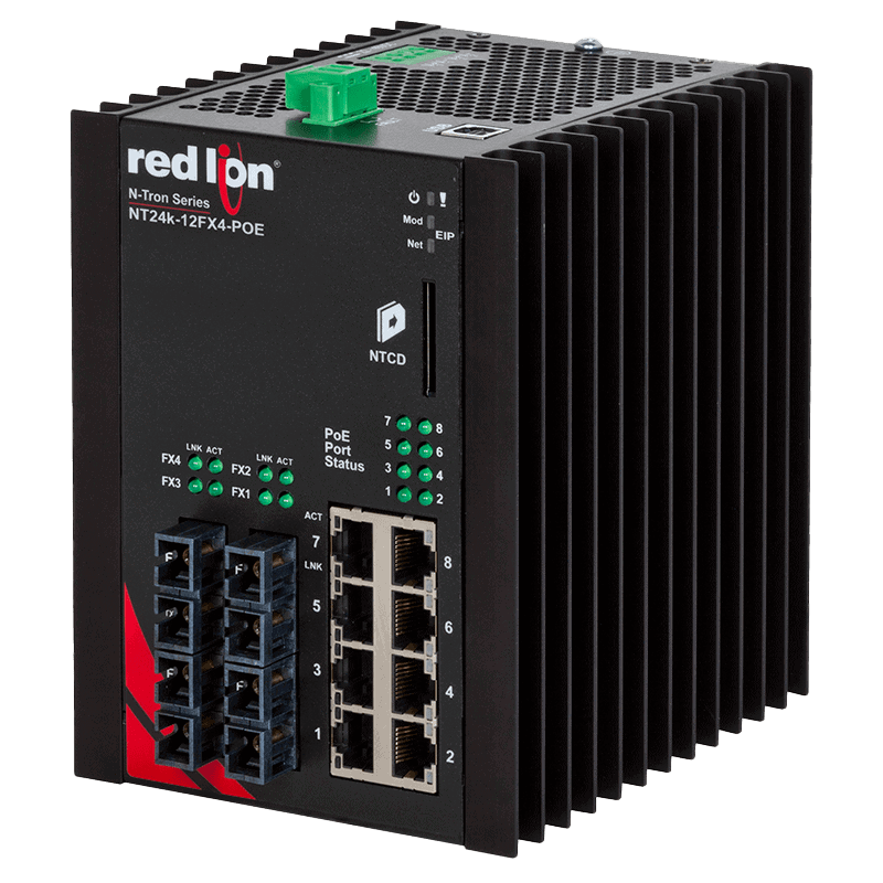 The N-Tron NT24k 12-Port Managed Gigabit Industrial Ethernet Switch is one of the easiest to deploy Ethernet switches in the industry. Simplified use, uncompromised performance and multiple configurations to fit your automation and industrial needs. Eight copper 10/100/1000BaseTX ports that each support PoE+ and four 100BaseFX 2km, multimode fiber ports with SC connectors.